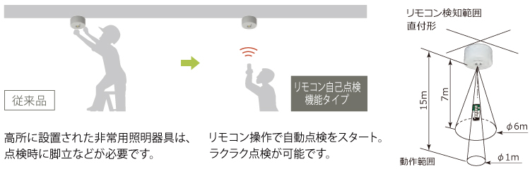 新たにリモコン自己点検機能タイプが登場。従来品に比べバッテリー容量の定期点検の負担を大幅に軽減。