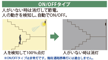 ●人感センサ付 ON/OFFタイプ※(※階段通路誘導灯には適合しません)の3タイプをラインアップ。