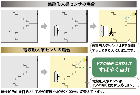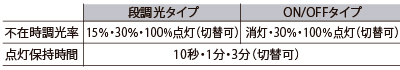 センサ動作の切り替えが可能で、不在時の明るさ(調光率)や点灯時間の長さ(保持時間)を設定できます。