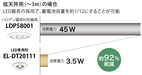 低天井用(~3m)の場合、ハロゲン75形器具と比べ消費電力92%削減。蓄電池容量を約1/12にする事が可能。