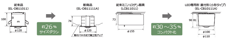 ・低天井用(~3m)…従来ハロゲン45形、白熱電球100形器具相当