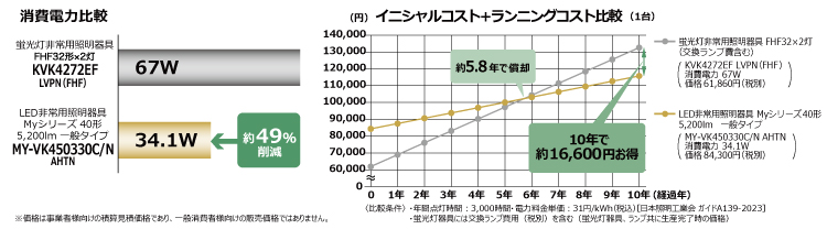 従来非常用蛍光灯器具と比較して初期費用+ランニングコストがダウン