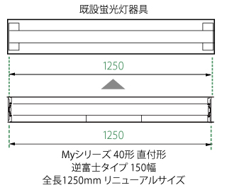 直付形 逆富士タイプ 150幅に、既設器具(蛍光灯器具)と同じ長さの全長1250mmリニューアルサイズをご用意。