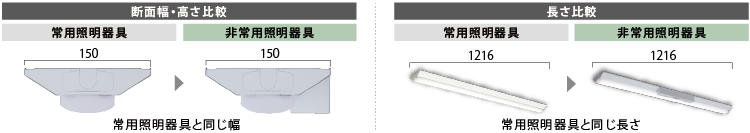 常用照明器具(一般形)と非常用照明器具のサイズ比較