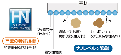 従来は両立が困難だった親水性(埃など)と疎水性(カーボン、タバコなど)のどちらの汚れ防止にも効果があるコーティングです。