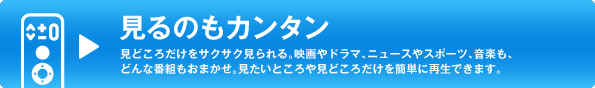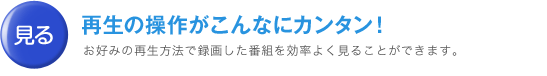 ![STEP1 〔見る〕ボタンを押すと、テレビ画面に録画した番組の一覧が表示されます。 STEP2 [上下]ボタンで録画リストの中から見たい番組を選び、[決定]ボタンを押すだけ!](images/look_new/000miru.jpg)