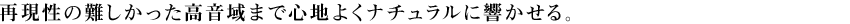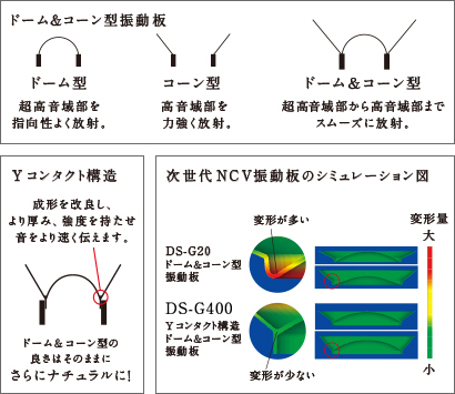 DIATONE上位モデルで採用したYコンタクト構造(ドーム&コーン型)振動板をDS-G400にも余すことなく注入。リニアな高音域再生を可能にするドーム型と、ワイドレンジ再生を実現するコーン型の長所を併せ持つ「ドーム&コーン型」を採用。伝搬速度が高く、金属振動板のような固有音を持たないNCV振動板の特性と相まって、力強く伸びやかでありながらピーキーな部分もなく、コンサートホールの雰囲気や空気感までも忠実に再現します。また、Yコンタクト構造によってドーム型とコーン型の接点部構造を最適化し剛性を増して可聴帯域内の共振をなくすとともに、ボイスコイルの駆動力をストレートに振動板に伝えることで、心地よい高音域特性を獲得。高音域の不自然な硬さや耳にまとわりつく音がないため、金管楽器や弦楽器などの再現性が難しい楽器までリアリティの高い再生を可能にしました。