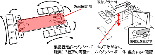 - ※ダッシュボードの曲率が大きい場合、ブラケットの製品固定部がダッシュボードに当接する場合があり、この場合は3箇所全ての両面テープが貼り付いていない可能性があるので取り付け不可となります。(ブラケットの両面テープ部分のみ(3箇所)がダッシュボードと当接している必要があります。)