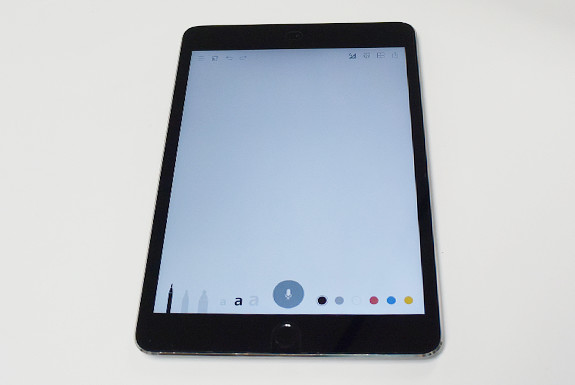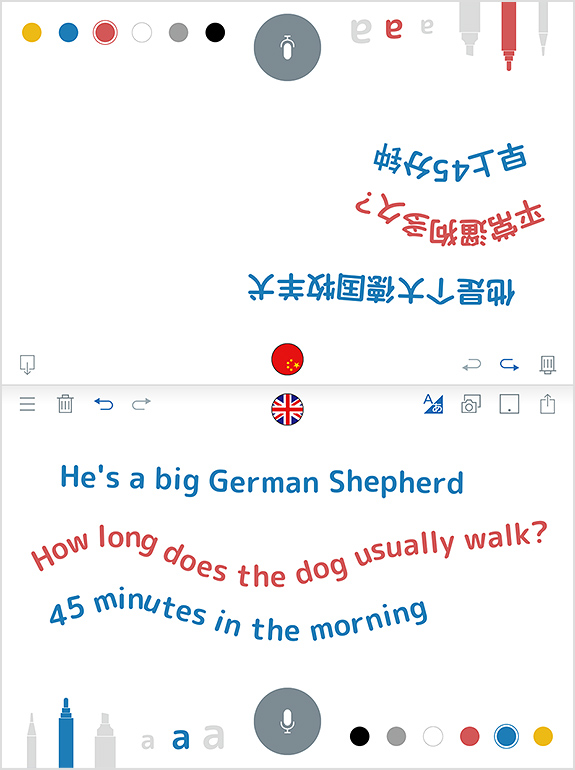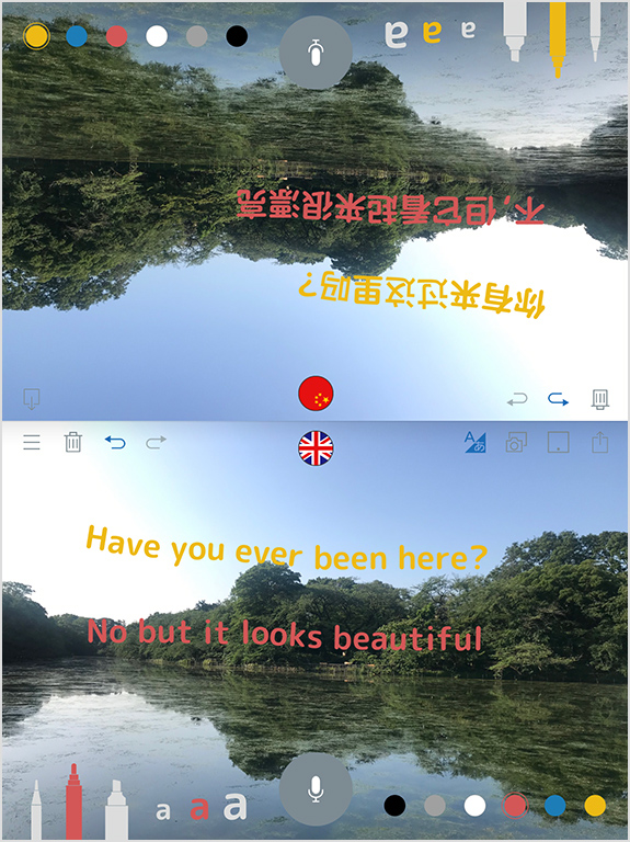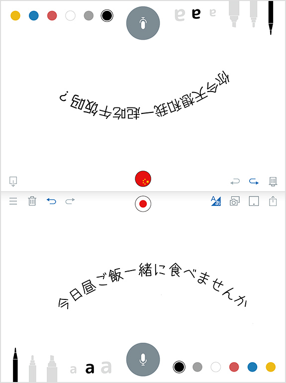アプリをたちあげて最初に表示される画面には、ペンや描く色を選べるアイコンが揃っていて、お絵かきアプリみたいな印象です。ほかの翻訳アプリと違うので、ちょっとドキドキしますね。