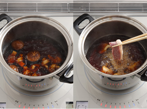 鍋に煮汁を入れ、【火力6】でひと煮立ちさせる。