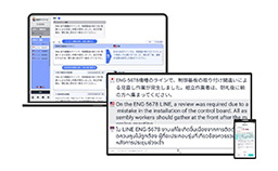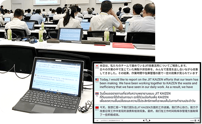 「翻訳サイネージ™」を活用 - タイ、中国、イタリア等拠点からメンバーが参加する全社的なグローバル会議において活用しました。翻訳サイネージ™は、発表内容を多言語で同時表示できるので、情報の伝達がスムーズに行えました。数名で1台のノートPCやタブレットを置き、各自が母国語で内容を確認しながら参加できる環境を整えました。
