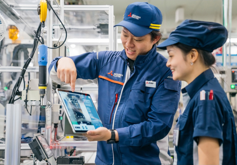 エコキュートを製造している三菱電機 静岡製作所 群馬工場。ブラジルやフィリピンなど多くの外国籍の方が働いています。工場では、毎朝10分程度の朝礼があり、安全、品質に関することや、その日の作業内容を連絡していますが、外国籍の方が、朝礼の内容を理解できず安全行動ができない、作業ミスをするといった課題がありました。そこで、大人数の場で多言語で伝達できるMelBridge®翻訳サイネージ™を導入しました。