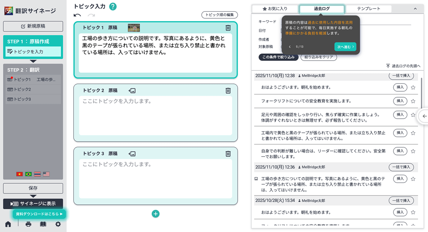 生産現場で実施される朝礼などの大人数への伝達に特化し、多言語を同時表示するコミュニケーションツール。