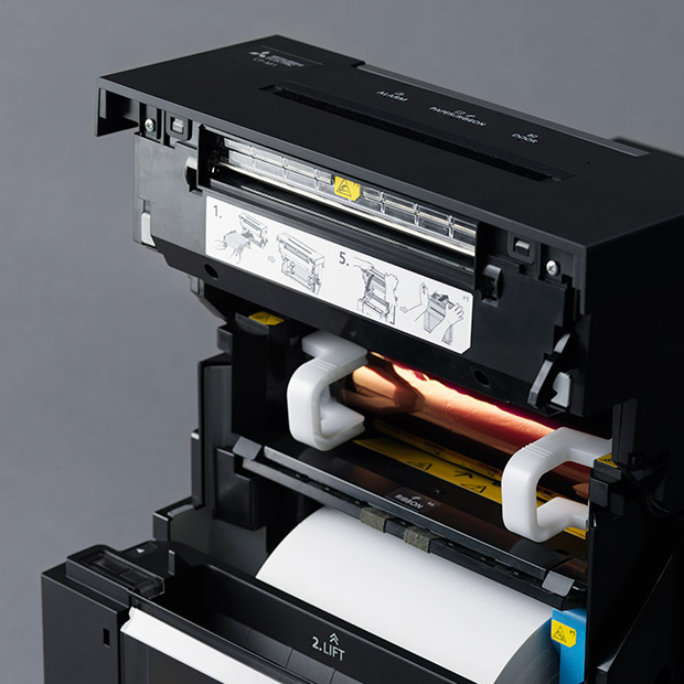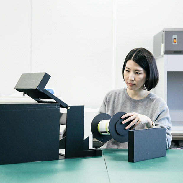 そこで、インクリボンとペーパー、ペーパーダストのレイアウトを集約し、一度にアクセスできる開閉構造を立案。紙で原寸のプロトタイプを作り、使い勝手を検証しました。この製品は他のシステム機器に内蔵されることもあるものなので、外寸は変えられません。中身もたくさんのパーツで構成されているため、何かを1ミリ移動することさえも難しい。こうした制約がある中で、設計者と何度も打ち合わせをし、微調整を繰り返しながら仕上げていきました。