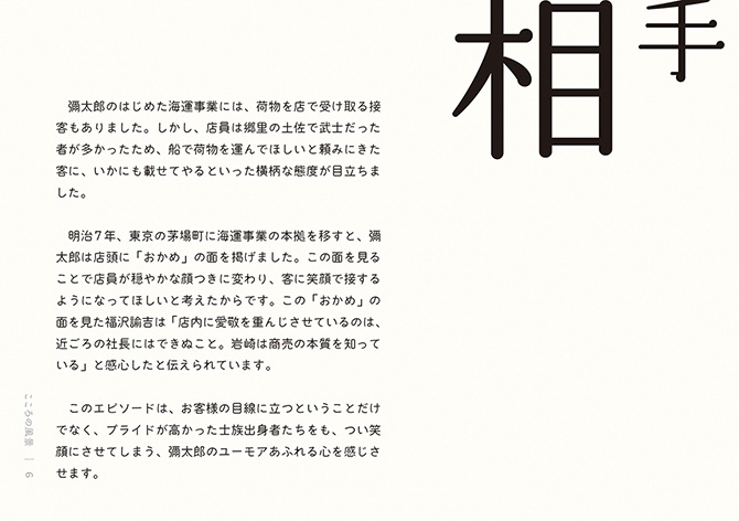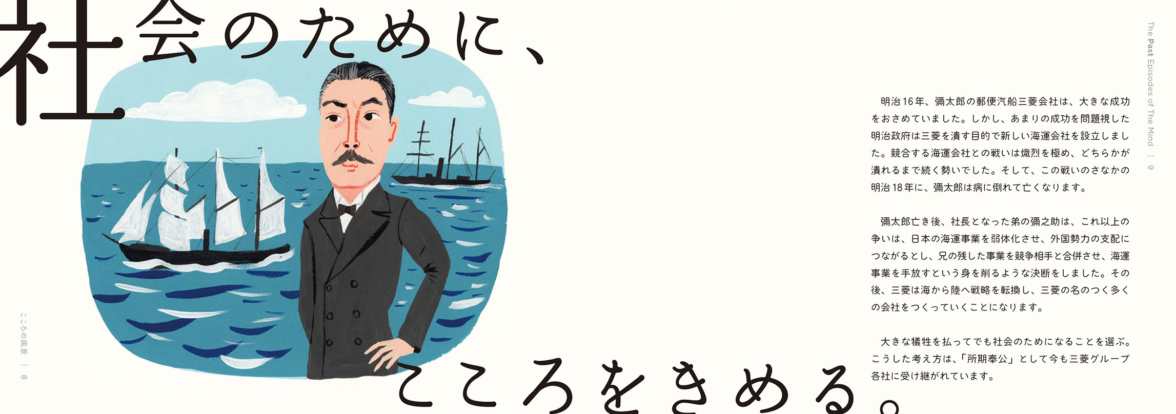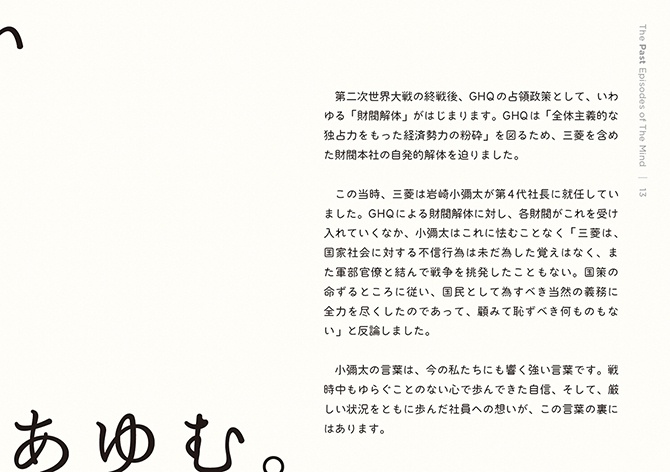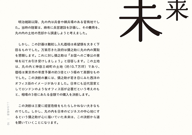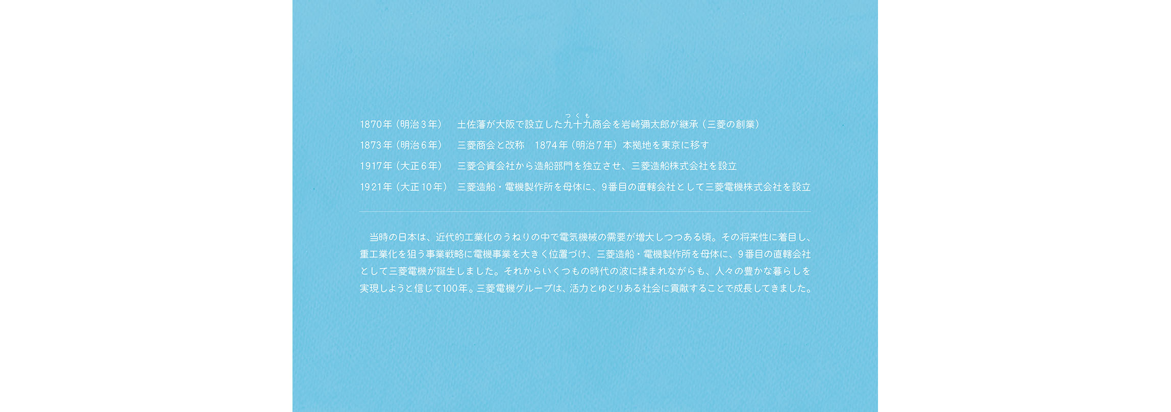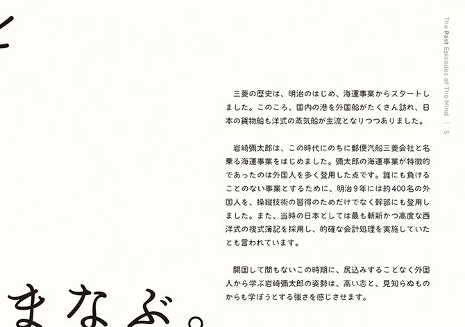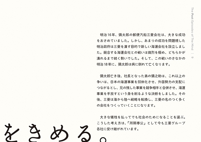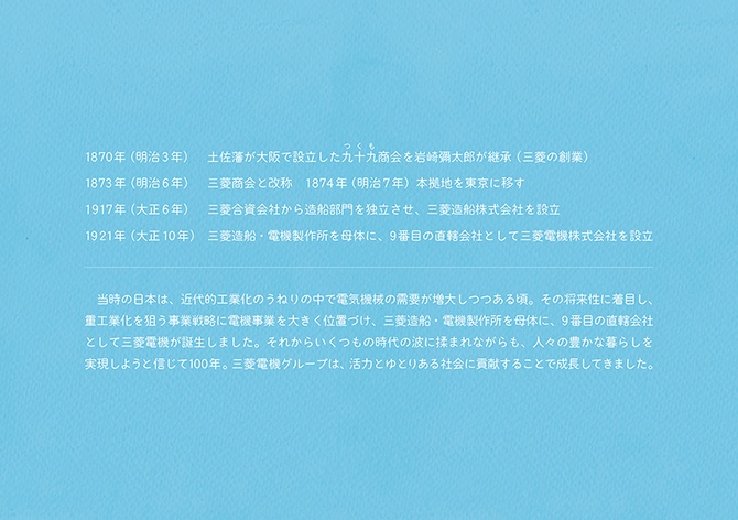 - こうした活動から、これからの社会において解くべき課題や大切にすべき価値が見えてきました。しかし、無数にある社会課題のすべてを私たちが解決できるわけではありません。それらの中から「三菱電機が何をすべきか」「他社ではなく三菱電機がやる意味は何か」を考えるよりどころとして、自分たちなりの価値基準を改めて認識する必要を感じていました。そこで、三菱グループの歴史を遡り、そのヒントを探ることにしました。歴史は私たちに文脈をもたらしてくれます。そしてその文脈が、今の私たちの取り組みに意味をもたらしてくれます。ある取り組みの社会的な意味は、社会的な文脈が与えてくれますが、「なぜ自分たちがそれをするのか」という自分たちにとっての意味まではもたらしてくれません。それは自分たちの文脈においてこそ見出すことができると考えています。