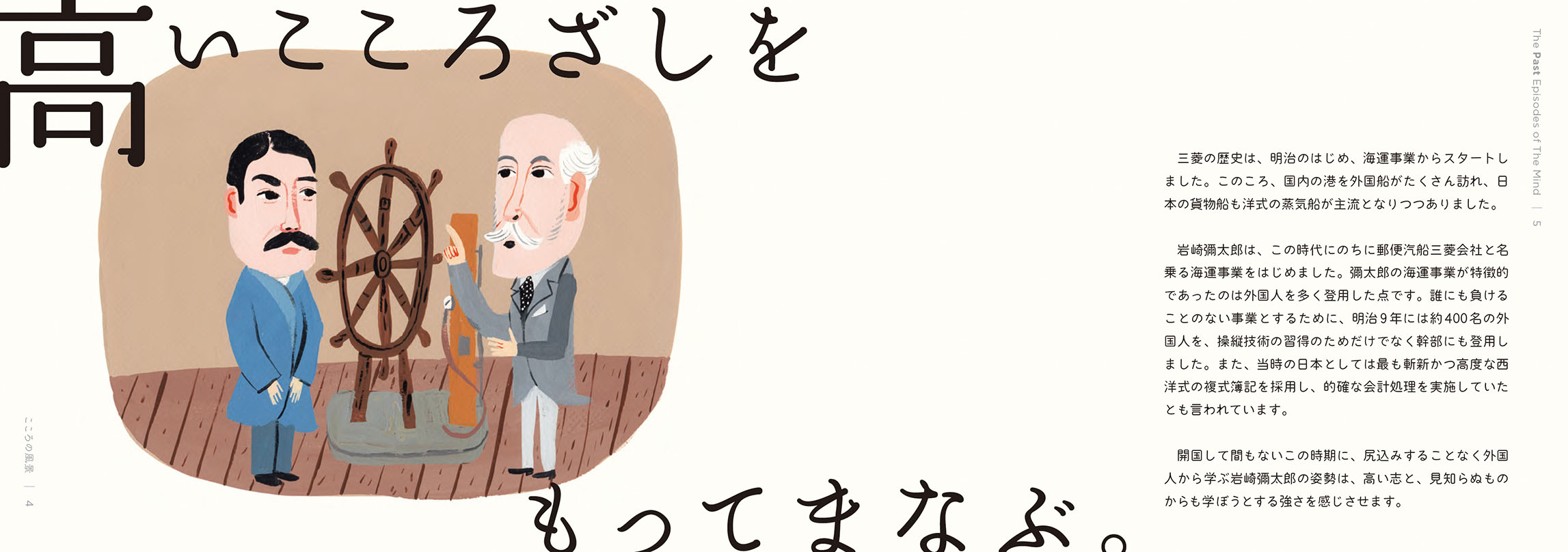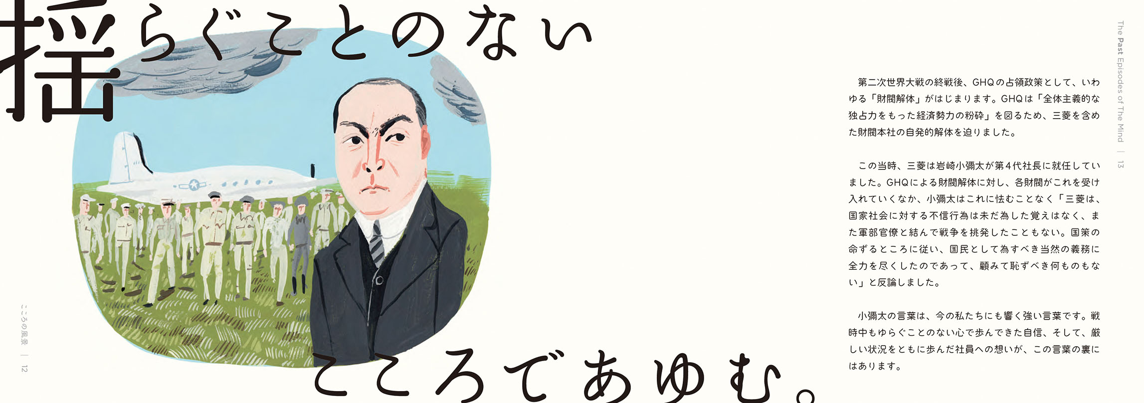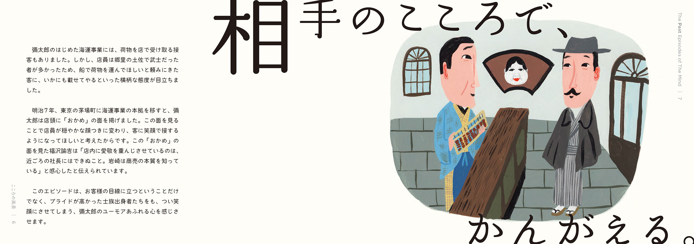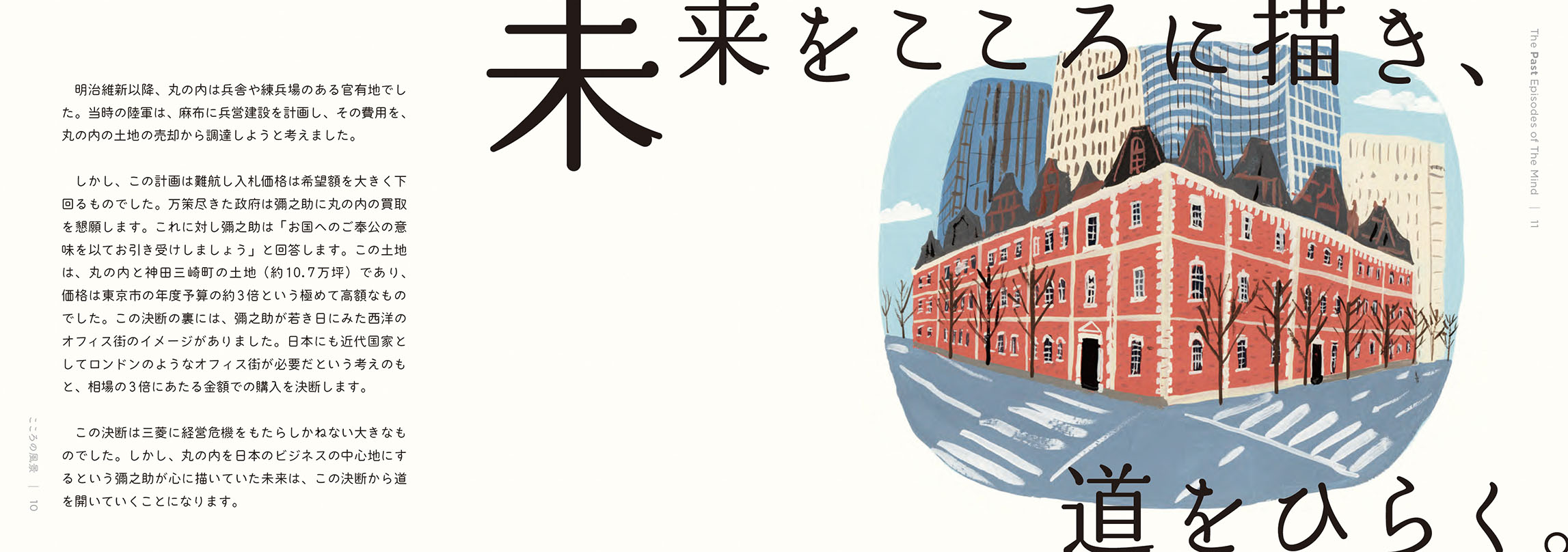 - こうした活動から、これからの社会において解くべき課題や大切にすべき価値が見えてきました。しかし、無数にある社会課題のすべてを私たちが解決できるわけではありません。それらの中から「三菱電機が何をすべきか」「他社ではなく三菱電機がやる意味は何か」を考えるよりどころとして、自分たちなりの価値基準を改めて認識する必要を感じていました。そこで、三菱グループの歴史を遡り、そのヒントを探ることにしました。歴史は私たちに文脈をもたらしてくれます。そしてその文脈が、今の私たちの取り組みに意味をもたらしてくれます。ある取り組みの社会的な意味は、社会的な文脈が与えてくれますが、「なぜ自分たちがそれをするのか」という自分たちにとっての意味まではもたらしてくれません。それは自分たちの文脈においてこそ見出すことができると考えています。