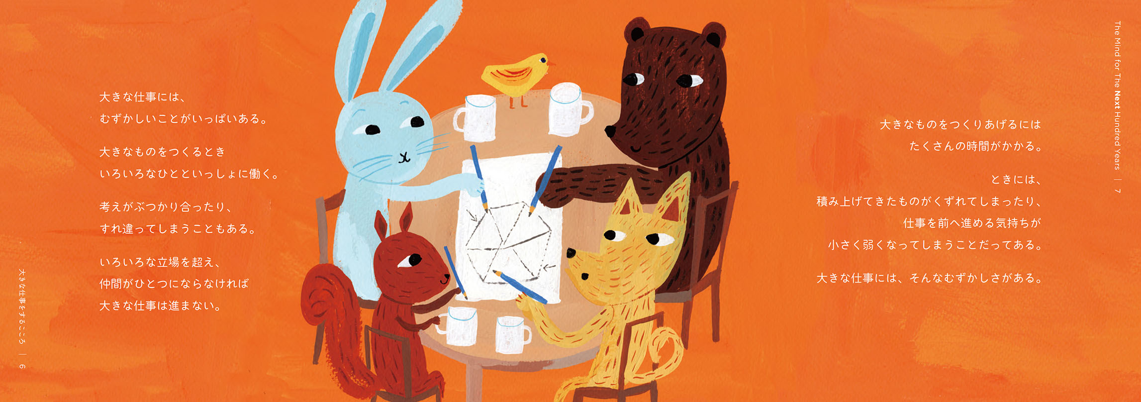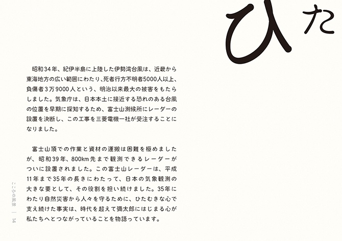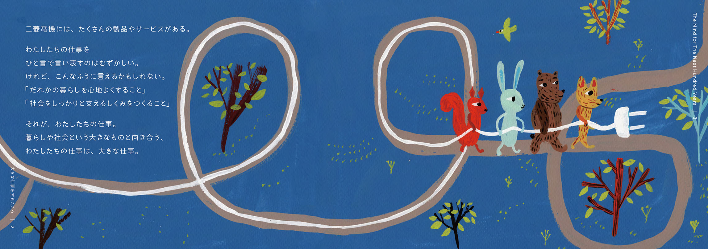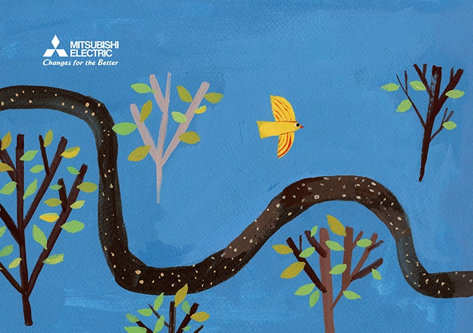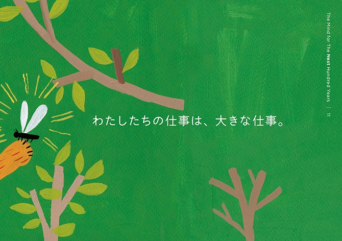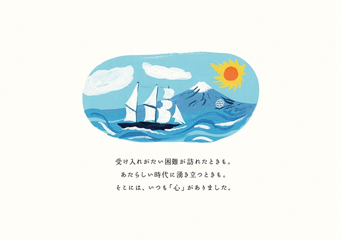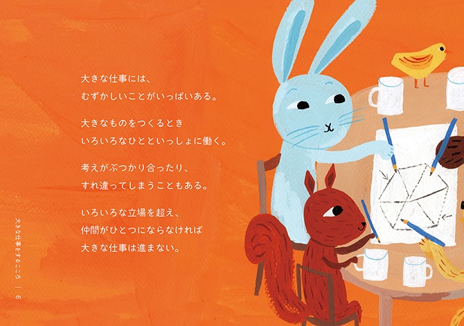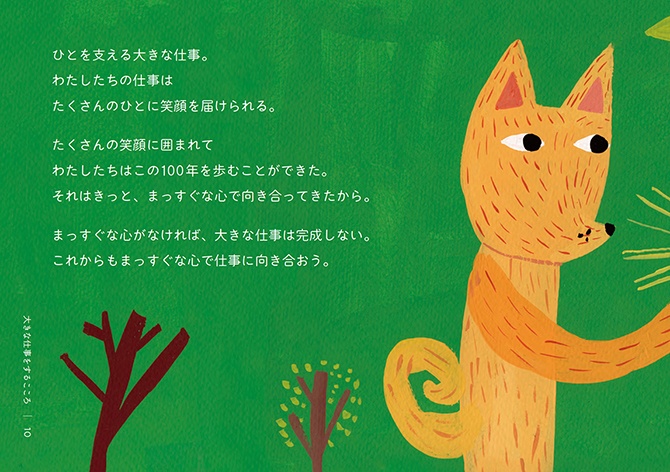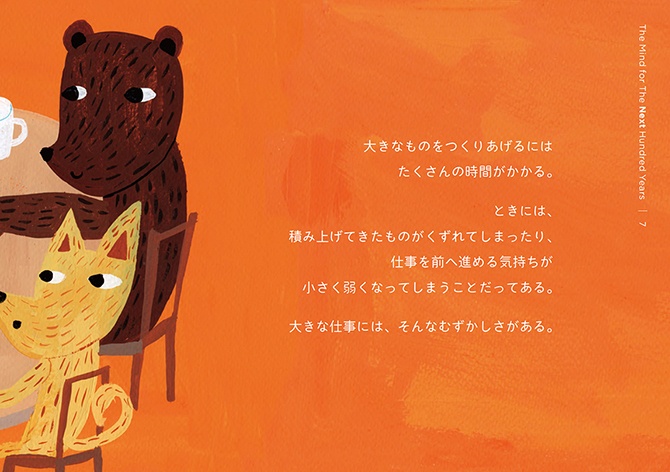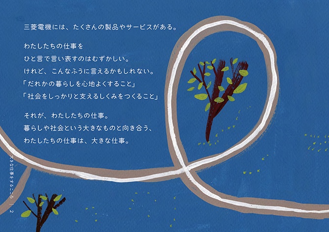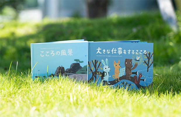 - 絵本は、2冊でひと組になっています。1冊目のタイトルは『こころの風景』。三菱電機の歴史から印象的なエピソードを抜き出し、三菱電機に受け継がれる「こころ」を感じられる内容にしました。もう1冊は、『大きな仕事をするこころ』。私たちの、仕事に向き合う「こころ」に焦点を当てています。個性や能力の異なる動物たちが、迷いながらも力を合わせ、ともに前進していく物語にしました。