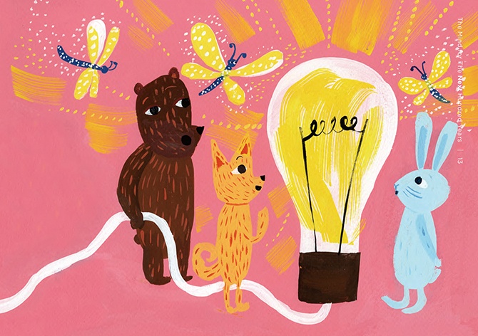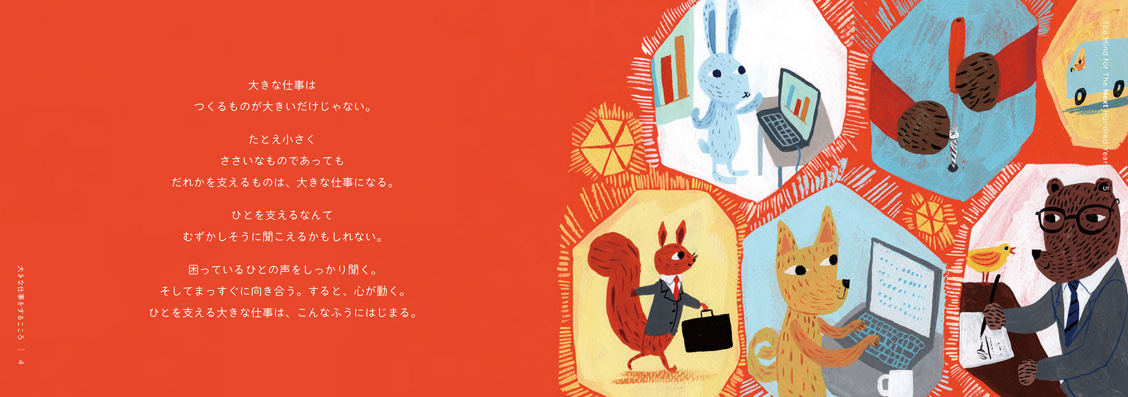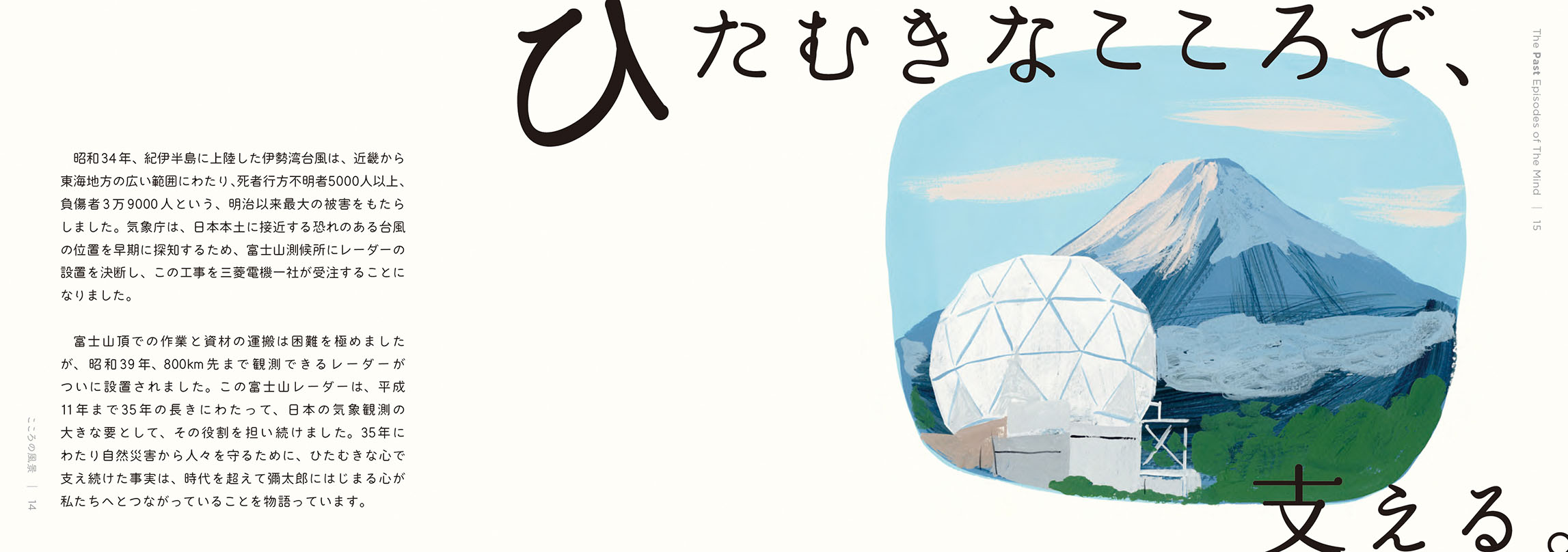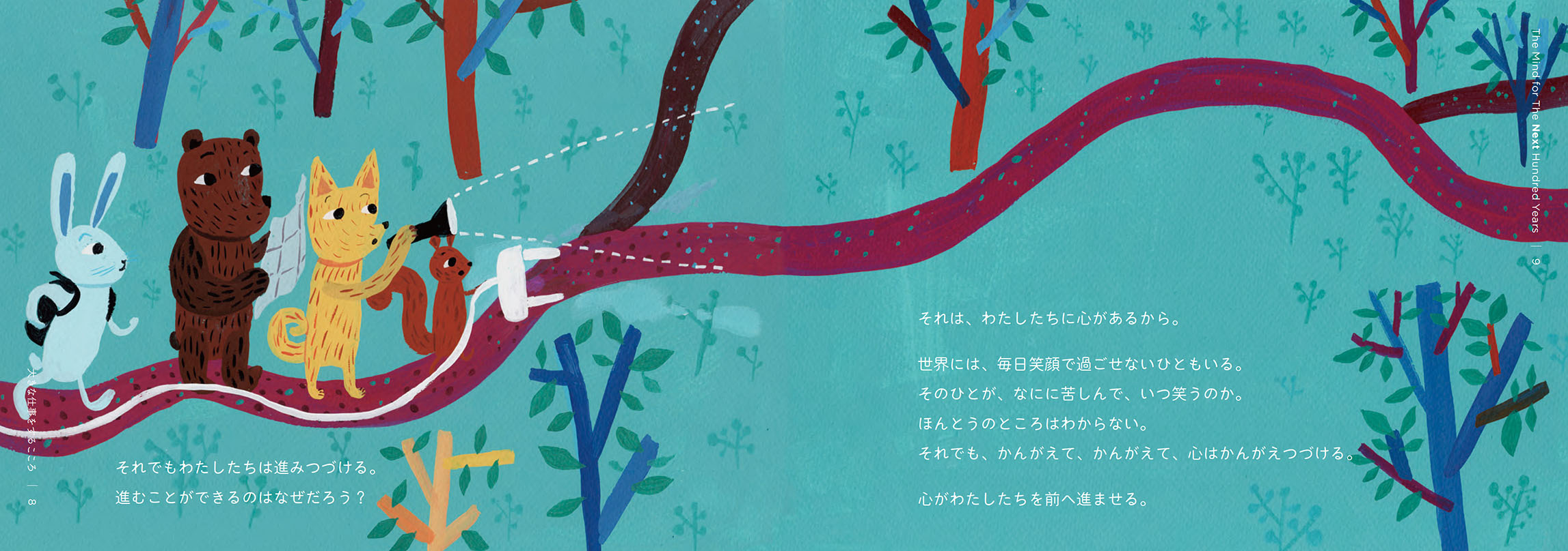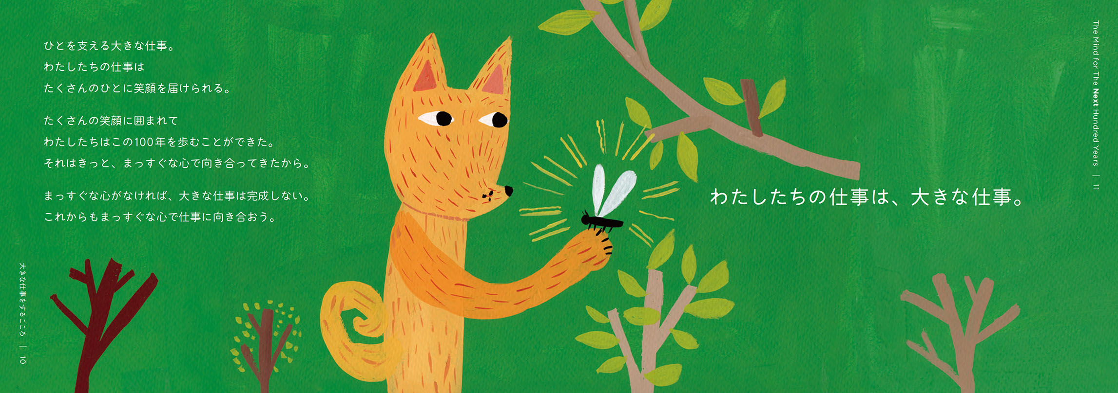- 絵本は、2冊でひと組になっています。1冊目のタイトルは『こころの風景』。三菱電機の歴史から印象的なエピソードを抜き出し、三菱電機に受け継がれる「こころ」を感じられる内容にしました。もう1冊は、『大きな仕事をするこころ』。私たちの、仕事に向き合う「こころ」に焦点を当てています。個性や能力の異なる動物たちが、迷いながらも力を合わせ、ともに前進していく物語にしました。