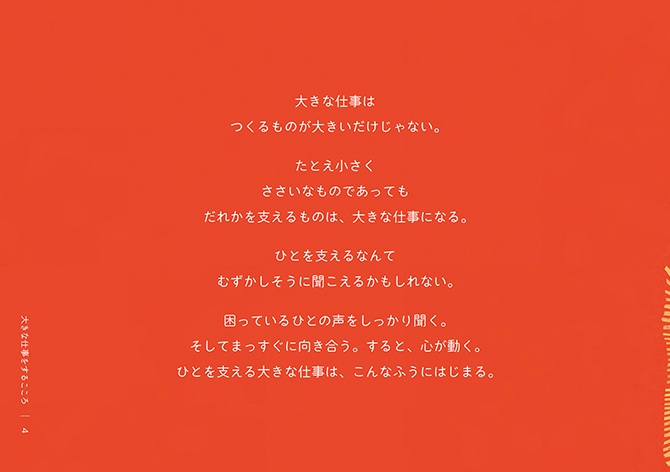 - 最初のプロトタイプが完成すると、統合デザイン研究所のある大船地区に勤務する他の社員にも読んでもらいました。総勢50名ほどからの感想を受け、読んでくれた人に何かポジティブなきっかけを残せるようブラッシュアップを重ねていきました。