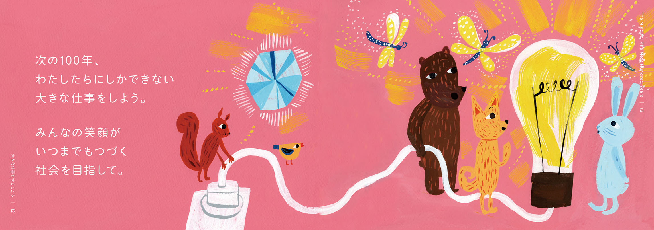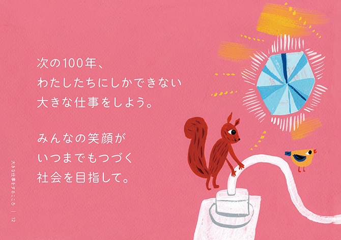 一方、社内には、三菱電機の創立100周年を契機に宣伝部が実施していたパーパスプロジェクト※という「私たちの仕事って何だろう?」「ちょっと立ち止まって一緒に考えてみませんか?」などのわれわれが絵本に込めたメッセージと同じ想いを持って活動していた施策がありました。この施策によって、完成した絵本は、三菱電機グループで働く15万人すべての人に届けることができました。 ※パーパスプロジェクトとは、従業員一人ひとりが改めて自分の存在意義や働く意味について考え、変革の原動力に繋げていくための全社施策です