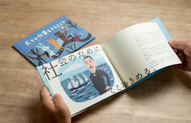 - やがて、自分たちが歴史を遡る中で感じたことを、全国各地で働く仲間とも共有できたら、という思いが強くなり、その方法を模索することになります。何らかの読み物にして伝えたいけれど、電子ファイルや薄いリーフレットでは「読みたい」と思ってもらうために十分とはいえません。思わず開きたくなり、読んだ後も大事に取っておきたくなるものを目指し、導き出したのが「絵本にする」というアイデアでした。