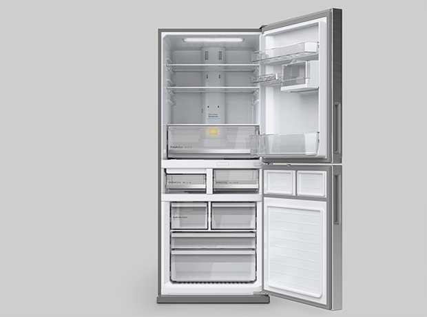 - コンセプトからモックアップを作り、量産化に耐える設計を探っていきました。悩ましかったのが、高級感のある外観を保った上で、いかにコストを抑えるかです。とりわけタイをメイン市場とした低価格帯モデルでは、これが大きなハードルになりました。実現したかったのは、ドア前面の樹脂ハンドルをなくし、鋼板素材のドアパネル自体を折り曲げてハンドルを形成するアイデアです。堅牢かつ洗練された印象になる上に、ホコリや汚れが溜まりにくく清潔に保てます。しかしながら、このデザインを実現しようとすると高コストになるため、何度も設計の修正を重ねることに。試行錯誤の末、ようやく量産できるモデルが完成しました。