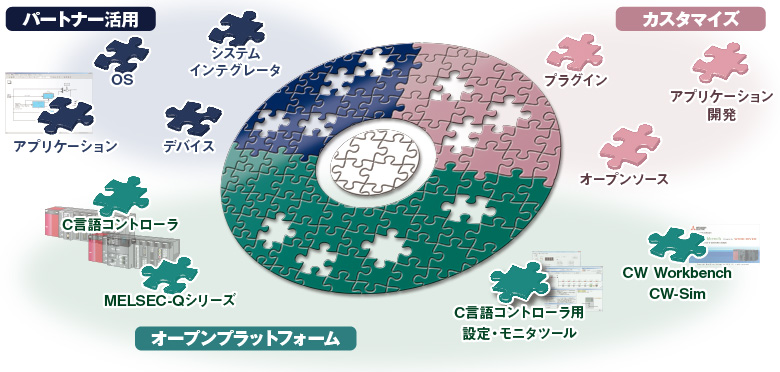 C言語コントローラとMELSEC-Qシリーズの各種ユニット、パートナー製品やオープンソース、お客様のプログラム資産などを組み合わせた、多彩なシステムの構築。