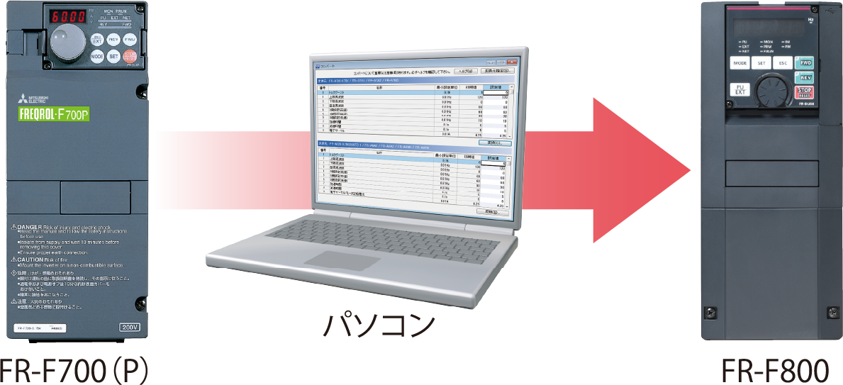 - インバータセットアップソフトウェア(FR Configurator2)のコンバート機能により、FREQROL-F700(P)シリーズはもちろん、FREQROL-F500シリーズ(対応予定)からのパラメータ設定の移行が簡単にできます。