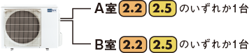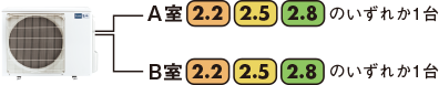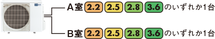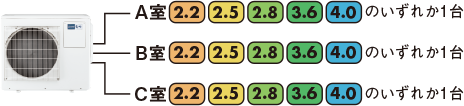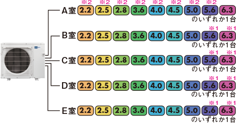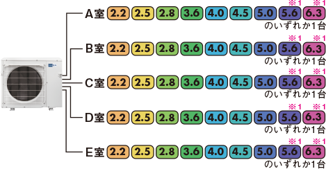 組合せ室内機は、すべて同時運転可能です。ただし室外機の最大能力の範囲で同時運転しますので、室内機1台あたりの冷房・暖房能力は、同時運転をすると1台運転時よりも低下する場合があります。組合せ能力についてくわしくは、暮らしと設備の業務支援サイト[WIN2K]より、性能表〈冷房・暖房能力仕様表〉をご覧ください。