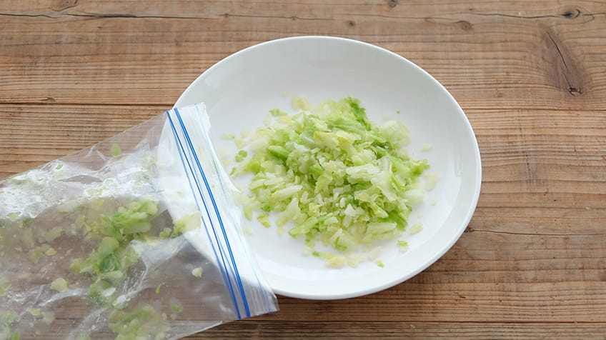 例えば、使い切れずに余ったキャベツは、ざく切りにして保存袋に入れて冷凍保存。料理に使いたいタイミングで、できちゃうV冷凍の設定をすれば、冷凍したまま、手で好きなサイズに砕いて、サッと料理に使うことができるんです。包丁やまな板を使う手間が省け、家事がもっとラクになります。