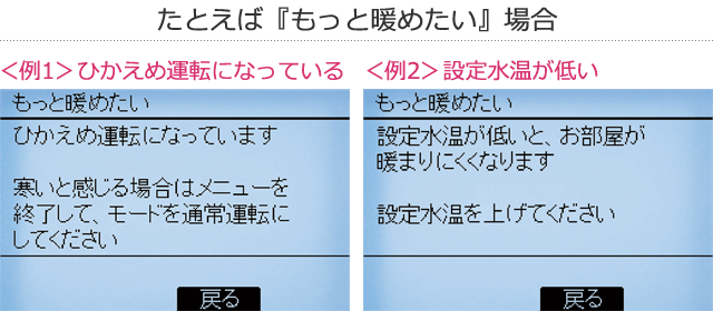 - 快適な運転設定をはじめ、電気代やメンテナンスのことなど、さまざまなご要望や疑問にリモコンでアドバイス。よりらく楽な暖房ライフを応援します。