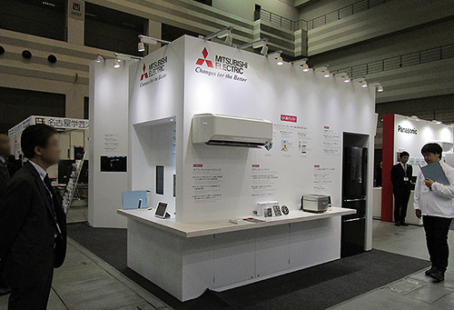 三菱電機は2ブースを確保し、らく楽アシスト製品の中から音声ガイダンス付のレンジグリル、ジャー炊飯器、IHクッキングヒーター、エコキュートの他、使いやすさに配慮した冷蔵庫、エアコン、食器洗い洗浄機、ブレッドオーブン、スティッククリーナー、除湿機を展示しました。