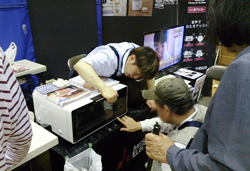 しゃべるテレビ、IHクッキングヒーター、ジャー炊飯器に加え、今回は5/21当日発売のレンジグリルを初出展しました。音声ナビによる簡単調理が大変好評で、行列ができるほど注目を集めました。