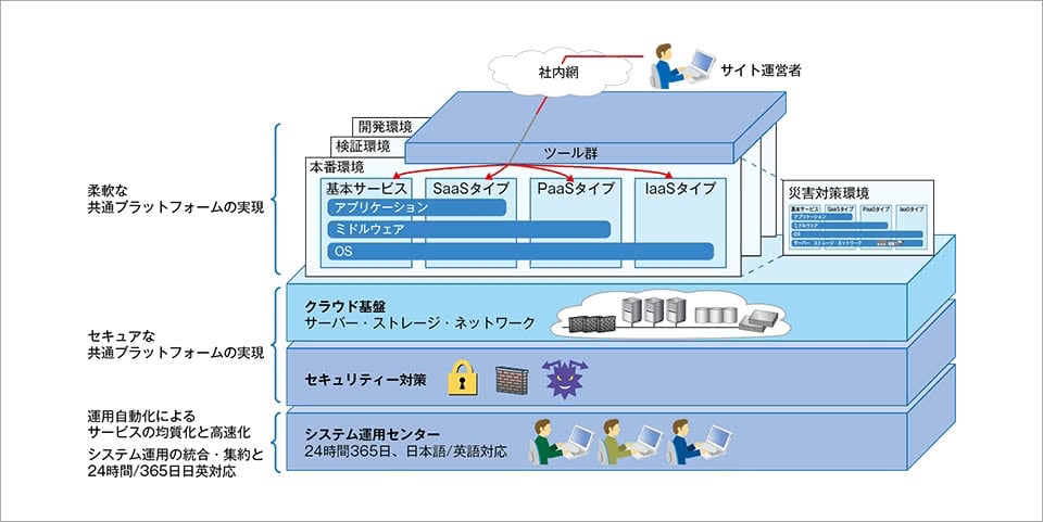海外を含むグループ各社が共通で使えるグローバルウェブサイト統合基盤の構築により、用途に応じたサービスを柔軟に提供できるようになりました。クラウドを利用した統合基盤は、必要なOS、ミドルウエア、アプリケーションに合わせてSaaS(Software as a Service)、PaaS(Platform as a Service)、IaaS(Infrastructure as a Service)の選択が可能で、ウェブサイトで会社概要や製品情報のみを公開したいところから、自社で機能を追加して固有の作り込みをしたいところまであらゆるニーズに対応します。