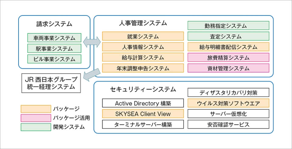 2011 年4月の導入時は、就業、人事情報、給与計算などからなる人事管理システムをパッケージで構築。社員の旅費を計算する旅費精算システムは、ALIVE SOLUTIONのワークフローを活用して自動化しました。パッケージではカバーできない勤務指定や超過勤務申請などを行う勤務指定システムや、定期昇給や賞与査定を行う査定システムは、MBがスクラッチで開発し、JR西日本グループの統一経理システムとの連携も実現しました。また、車両事業、駅事業、ビル事業独自の作業請求内容を管理し、作業にかかった超過勤務等を請求できるよう就業システムと連携する請求システムを別途スクラッチ開発しました。これにより請求漏れをなくすことが可能となりました。