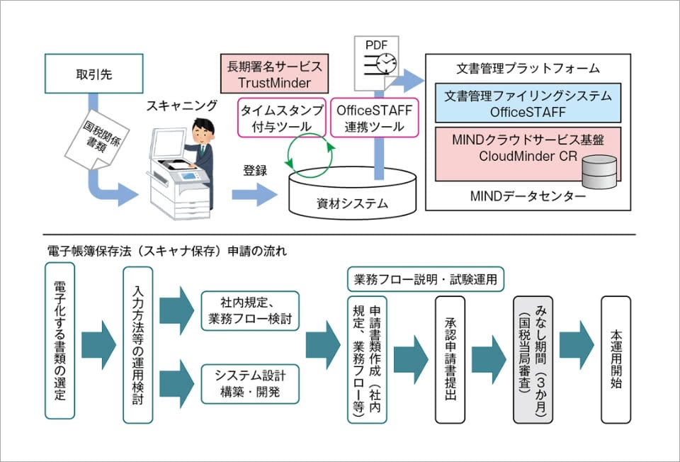 電子帳簿保存法対応に必要なタイムスタンプにはMIND の長期署名サービス「TrustMinder」、電子文書の管理には三菱電機エンジニアリングのOfficeSTAFF※2」が採用されました。