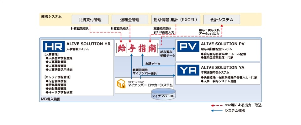 マイナンバーの管理には、給与指南と親和性が高いMBの「パッケージプラス®マイナンバーロッカーシステム」を採用。新たに導入する人事管理システムについてはMBの「ALIVESOLUTION」の中から「人事情報システム(HR)」「給与明細書配信システム(PV)」「年末調整申告システム(YA)」を採用しました。