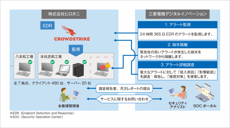 複数社のサービスを比較した同社は、三菱電機デジタルイノベーションのマネージドEDRサービスを採用しました。採用の決め手は、信頼性の高いクラウドストライク社のEDR製品と、長年大手製造業や金融業向けに運用を行ってきた実績を持つセキュリティアナリストが24時間365日監視・検知し、分析を行うSOC(Security Operation Center)サービスを組み合わせた提案にありました。