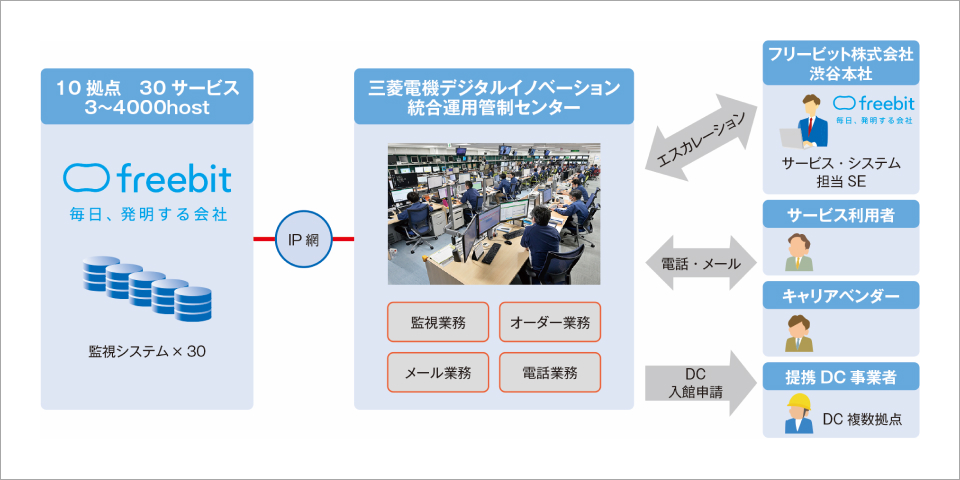 インターネット事業やモバイル通信事業を展開するフリービット株式会社。同社グループで、法人向けにホスティングを中核としたクラウドインフラ事業を手掛ける株式会社ベッコアメ・インターネットは、自社データセンターの閉鎖に伴い、サービス基盤を三菱電機デジタルイノベーション株式会社のデータセンターに移設しました。併せてネットワークオペレーションセンター(NOC)の業務をアウトソーシングし、サービス品質を維持したまま、NOC運営コストの削減を実現しました。