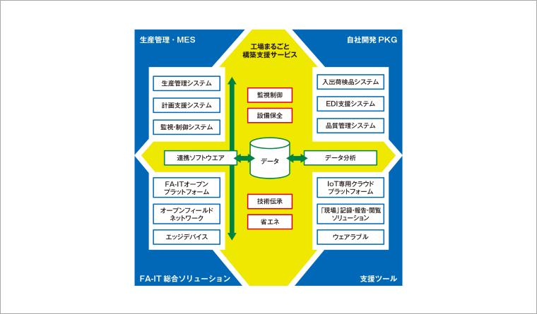 こうした課題を解決するためには、FA(Factory Automation)による製造現場の自動化と、生産管理システムや工程管理システム、監視・制御システム、物流管理システムなどに代表されるITの活用が欠かせません。