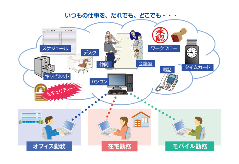 会社でもテレワークでも同じツールが使えれば、いつもの仕事をだれでも、どこでも行える。
