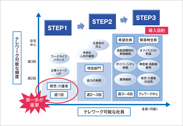 テレワークが可能な範囲を少しずつ広げていくことで、将来的に大きなメリットが期待できる。