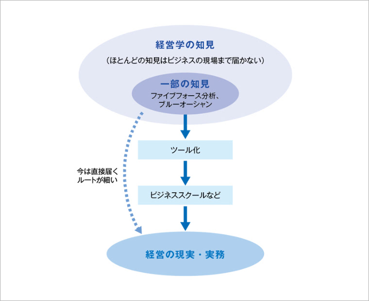 ビジネススクールで学ぶファイブフォース分析などの知見は、実務で使いやすいようにツール化されたもの。それ以外の知見は、専門家以外には分かりにくいなどの理由でなかなかビジネスの現場には届かない。