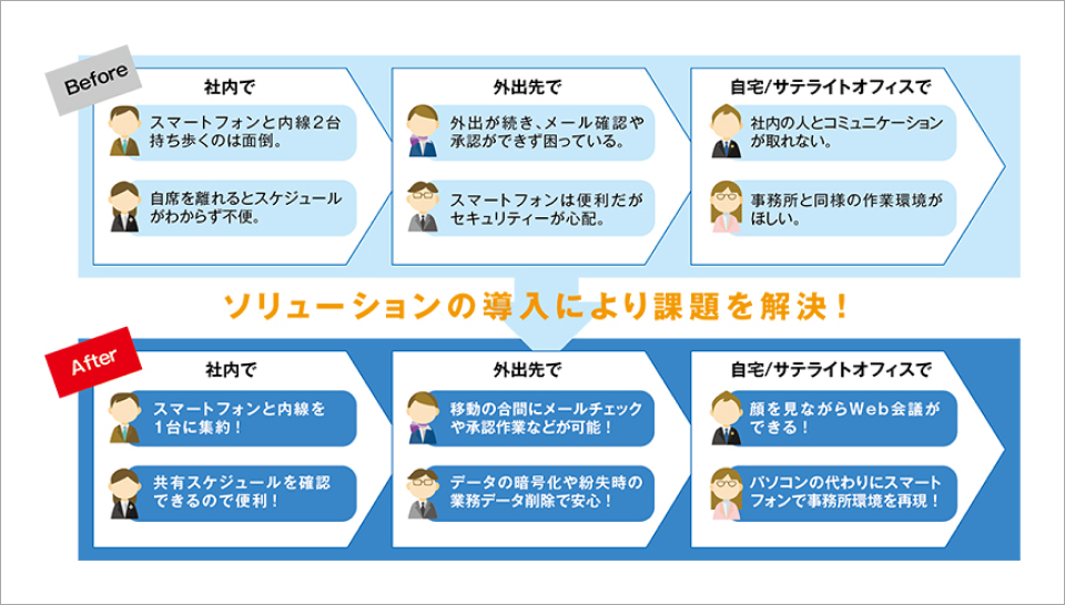 サービスの導入にあたり、モバイル端末の種類と利用形態を標準化し、移動中はスマートフォン、サテライトオフィスではノート型シンクライアントまたはiPadの利用に統一しました。