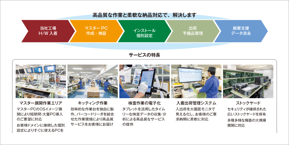 「お客様からはキッティングの現地作業、PC配付・設置の代行などの要望をいただくことが多いです。また、運用業務として、予備品の管理、データ消去、廃棄支援の対応依頼をいただくこともあります」
