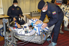 ソユーズ宇宙船は国際宇宙ステーション(ISS)から分離後、不要なモジュールを切り離し、大気圏に突入。高度約10kmから次々にパラシュートを開いて、地上に着陸。ISSから離れてから約3時間半で帰ってきてしまうという「国内旅行」並の近さだが、体への負担はスペースシャトル着陸時より大きい。重力加速度は通常で4~5G(自分の体重の4倍~5倍がのしかかる)。姿勢を制御できない場合は「弾道突入モード」になり、8~13Gかかることもあるという。