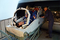 案内をしてくれた、セルゲイ・アウデエフ飛行士は宇宙滞在記録748日を誇る英雄だが「8Gのテスト中のビデオを後で見せてもらったら、遠心力で顔がゆがみ50歳くらい老けて見えた。でも実際の宇宙飛行はもっとシビア。誰も宇宙船を止められない・・・」と教えてくれた。重力のかかる方向が重要で、胸から背中のほうは比較的大きなGでも耐えられるが、頭から足の方向にかかるのはキツイらしい。
