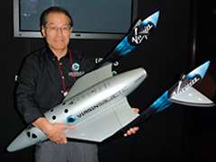 宇宙船スペースシップ2の16分の一の模型を抱える浅川恵司さん。2014年1月6日に設立されたクラブツーリズム・スペースツーリズムの代表取締役社長。