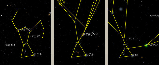 星の位置と運動を精密に調べることで、過去に遡ることができる。画像はオリオン座。(左から現在、約100万年前、約195万年前)。時間を遡っていくと星の位置が変化していくことがわかる。左肩にあるベテルギウスがどこから生まれたかは今、ホットな話題。