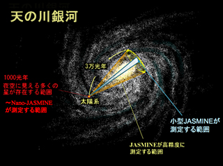 日本の位置天文衛星JASMINEの観測ターゲット。2015年打ち上げ予定のナノ・ジャスミン(赤)は太陽系から1000光年の範囲。2019年以降の小型ジャスミン(青)では天の川の中心を世界で初めて観測、さらに2020年代にはジャスミン(オレンジ)で天の川中心の100万個の星の観測を目指している。
